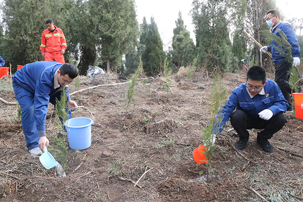 翠绿的方山春寒料峭,但丝毫不影响大家高涨的植树热情。植树队伍划分为开荒组、刨坑组、栽种组、浇灌组,大家分工有序,彼此协作,清理枯枝、掘土刨坑、移苗栽种、提水浇灌一气呵成。经过一番热火朝天的劳动,一颗颗雪松毅然挺立,漫山遍野的绿色再添新丁,众人劳作中忙碌的身影,更成为万绿丛中的一抹蓝色点缀,呈现出一片生机盎然之景。